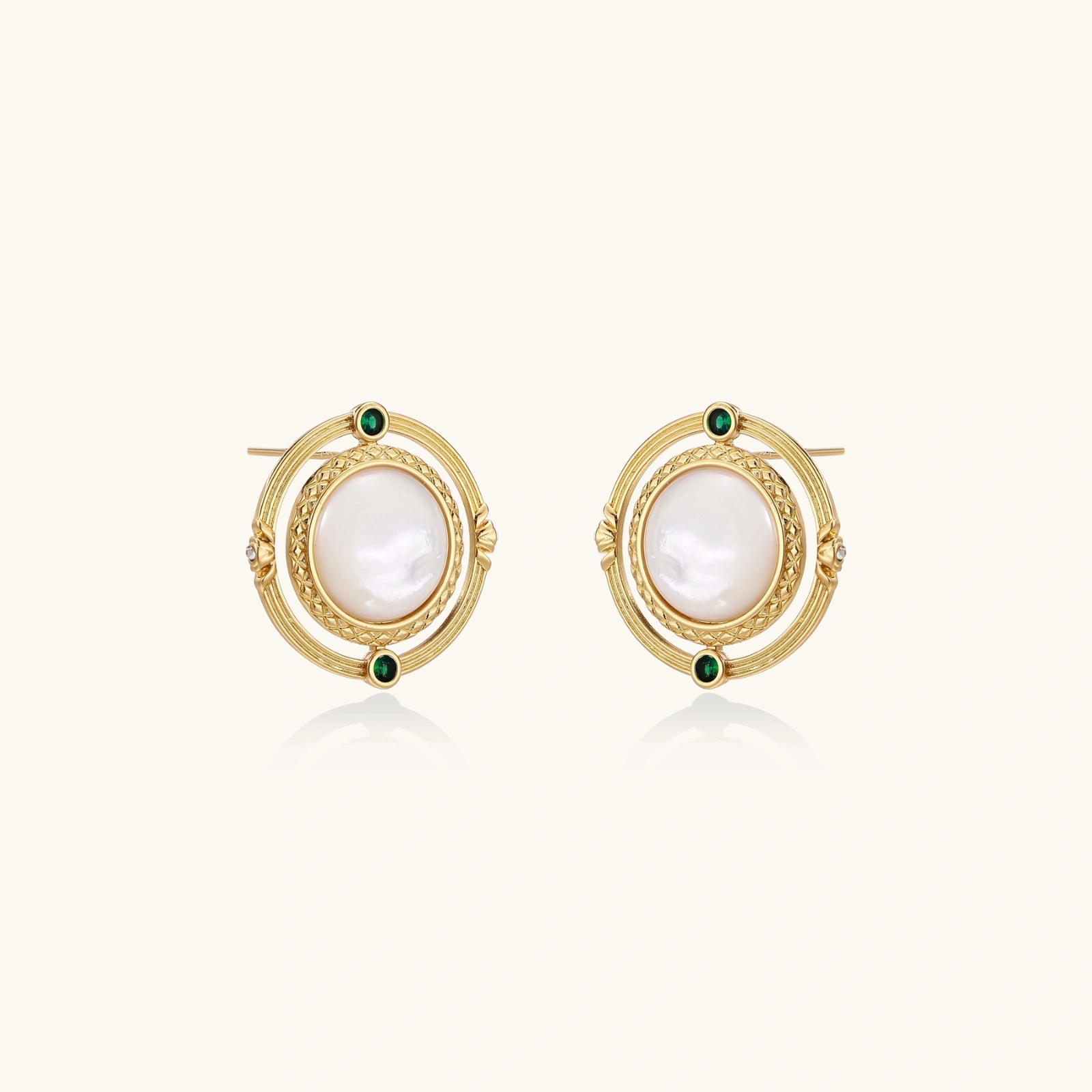 Vintage-vibber møter moderne eleganse. Ekte perlemor – kjent for å pleie feminin energi – står i sentrum av disse Art Deco-inspirerte orbitalene. Innrammet av smaragdgrønn zirconia og varmt gull, gir disse smykkene en drømmende "stargazer"-følelse. Perfekt for brunsj med venner, galleribesøk, eller når du virkelig vil kanalisere din indre soft boss.