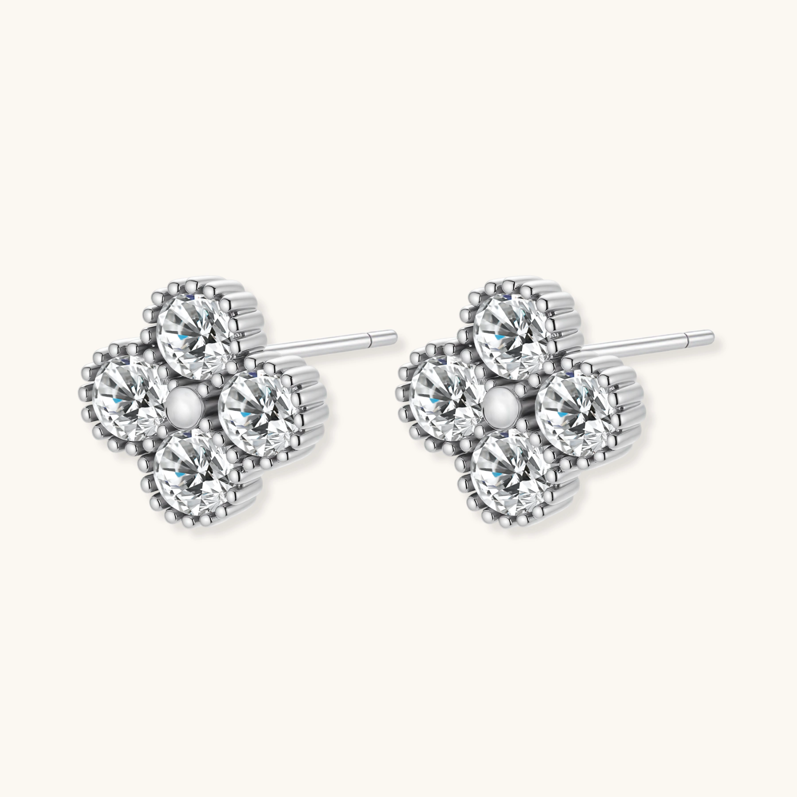 Sett fokus på stilen med våre Quatrefoil Moissanitt-studs. Disse delikate øredobbene i ekte sølv er prydet med glitrende moissanitt – en stein kjent for å fremme intuisjon og emosjonell balanse.