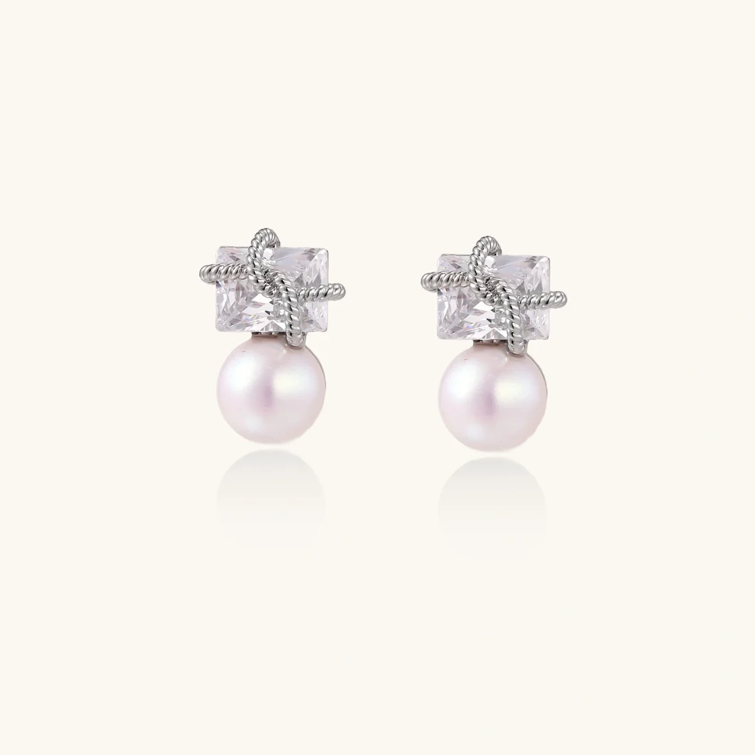 Her møtes arkitektonisk presisjon og myk femininitet. Rammer i hvitt gull-belagt messing omkranser geometriske krystaller over vakre ferskvannsperler – kjent for å nære feminin energi. Disse øredobbene skaper en uanstrengt eleganse som passer perfekt til alt fra galleriåpninger til solnedganger på en takterrasse.