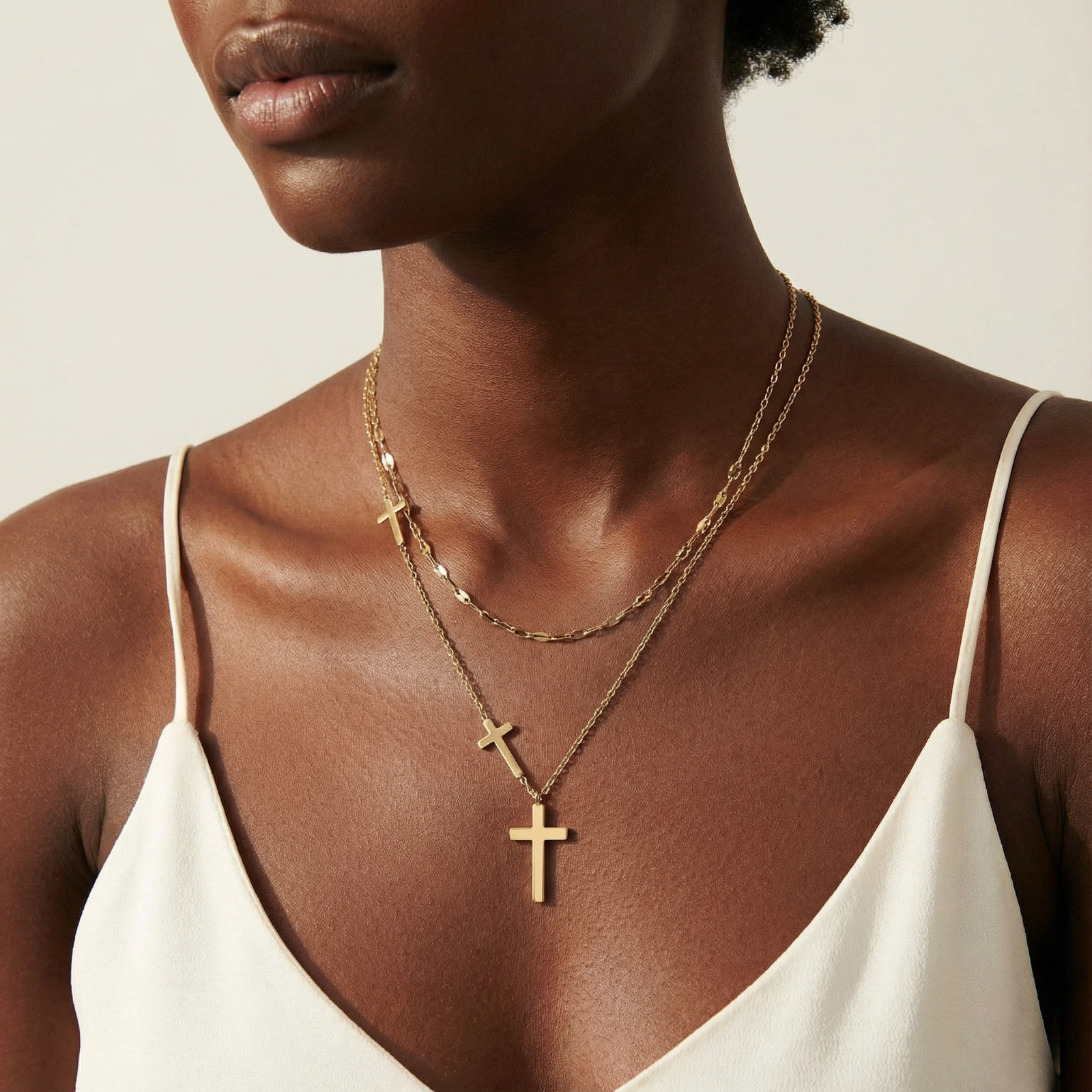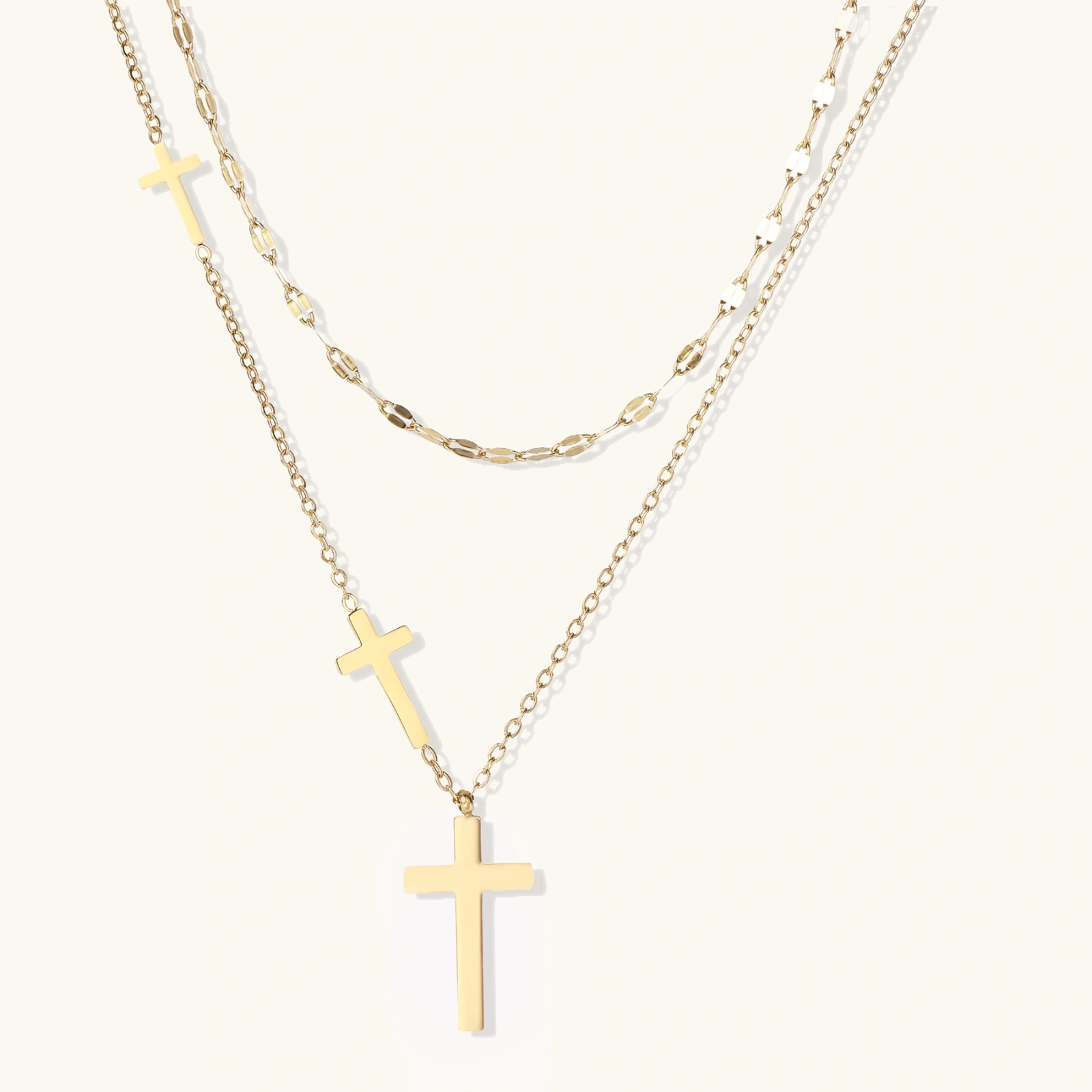 Dette lag-på-lag-settet i 14K gullbelagt rustfritt stål utstråler varme og beskyttelse, enten du leder en samling eller eier rommet på en galleriåpning. Hvert kjede forteller sin egen historie, samtidig som de sammen skaper en harmonisk og strålende helhet.