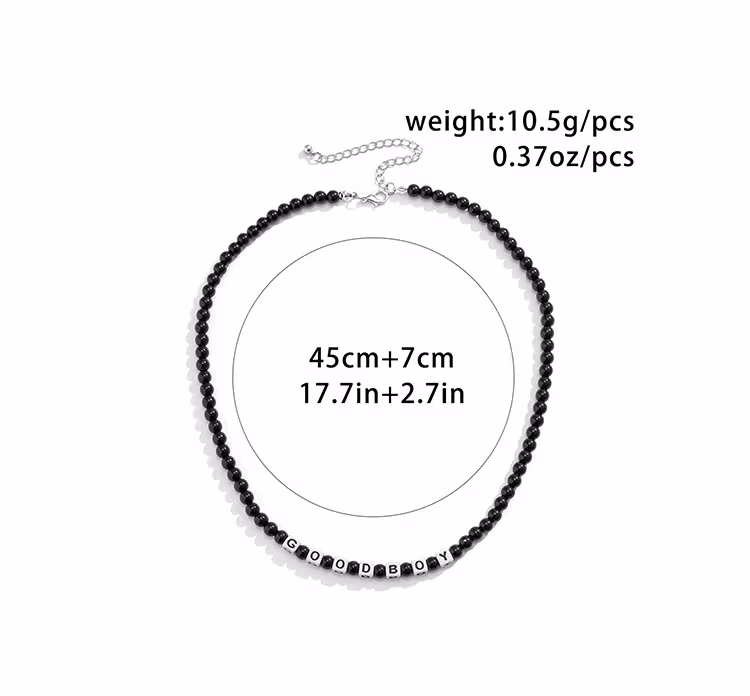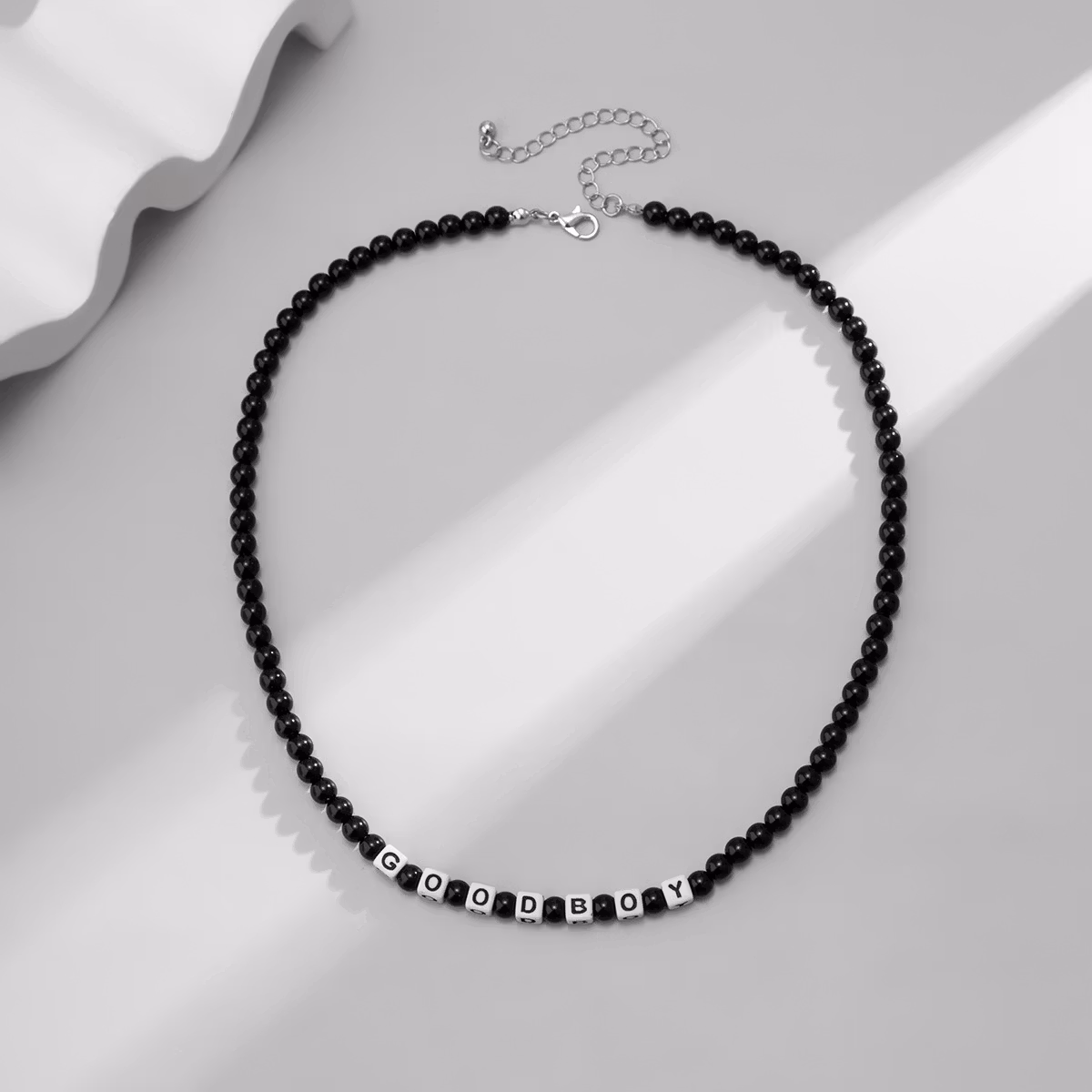 Svart perlesmykke med hvitt firkantet GOOD BOY bokstavdesign | Titanstål | N485